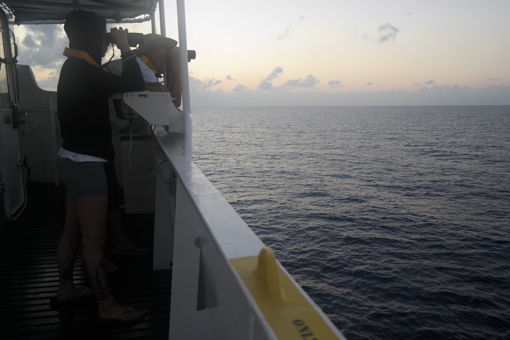 Ferry ist einer der ersten am frühen Morgen auf der Brücke. Der Chef des Teams von »Ärzte ohne Grenzen« lässt das Fernglas konzentriert über das dunkle Blau wandern, den ersten Kaffee hat er bereits vor dem Sonnenaufgang geleert. Seine hünenhafte Statur in Kombination mit der Expertise strahlt Autorität aus. Mit dem Cowboyhut, dem gepflegten Vollbart und dem Oberarm-Tattoo hätte man ihn an einem anderen Ort für einen Wildjäger halten können. Hier jagt er eben Schiffe. »Dort ist ein schwarzer Fleck«, murmelt er auf einmal, es ist kurz nach halb sieben. Ani vom »Search and Rescue«-Team (SAR) stellt sich neben ihn, auch sie schaut nun durchs Fernglas. »Es ist vermutlich ein Fischerboot«, schätzt Ferry. »Diese oder Militärboote sind eher schwarze Flecken, Flüchtlingsboote eher weiße.« Als ich auf das Wasser blicke, sehe ich nur schäumende Düsternis, eine Trockenheit liegt in der Luft.