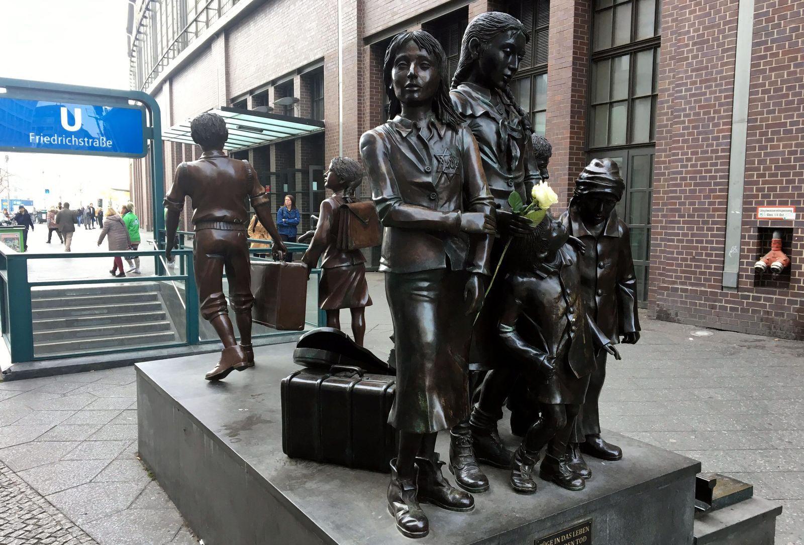 Direkt neben dem Bahnhof Friedrichstraße an der Kreuzung Georgenstraße/Friedrichstraße befindet sich eine nahezu lebensgroß gestaltete Kindergruppe aus Bronze. Zwei der Kinder lachen. Neben ihnen stehen gepackte Koffer, hoffnungsvoll blicken sie in Richtung Westen. Die anderen fünf Figuren hingegen schauen voller Angst in die entgegengesetzte Himmelsrichtung. Der Junge mit dem Koffer in der Hand und das Mädchen mit dem Schulranzen stehen für die Geretteten. Die anderen fünf Mädchen und Jungen sollen die 1,5 Millionen Kinder symbolisieren, die von den Nazis in den Konzentrations- und Vernichtungslagern im Osten ermordet wurden.