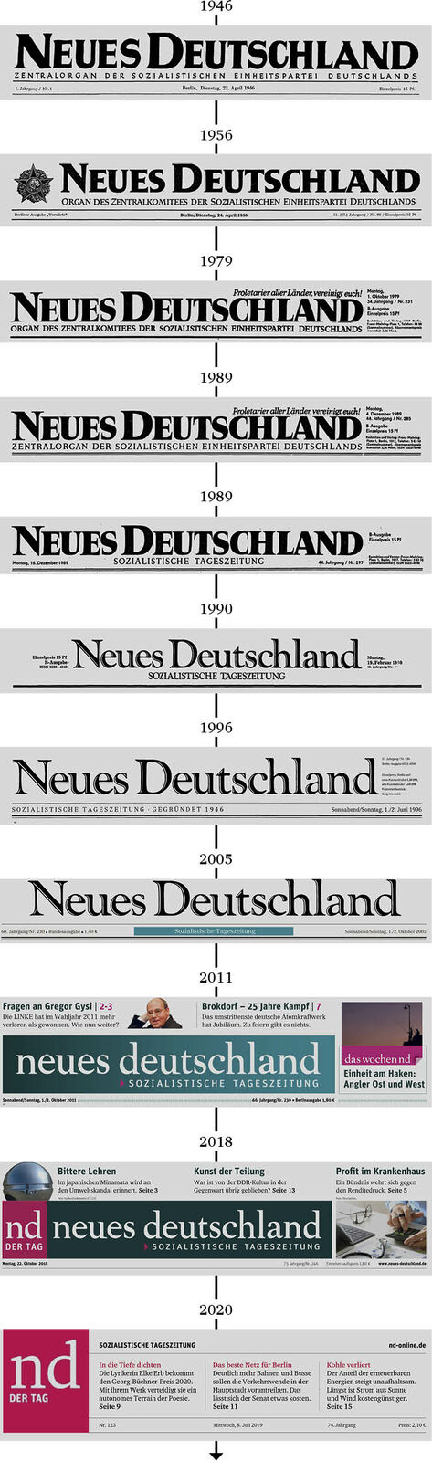 Das ist auch jetzt nicht ausgeschlossen. Aber jetzt, im Jahr 2020, sagen wir: Die 30 Jahre des zweiten nd-Lebens wiegen schwer; sie sind eine neue Geschichte. Sie geben uns das Selbstbewusstsein, die Veränderung auch im Zeitungstitel deutlich zu machen. Wir haben erst uns und unsere Zeitung gründlich verändert, nun folgt das Label - nicht andersherum. Aus »neues deutschland« wird mit dieser Ausgabe »nd.DerTag«. So, wie wir am Wochenende schon seit fast zwei Jahren als »nd.DieWoche« erscheinen.