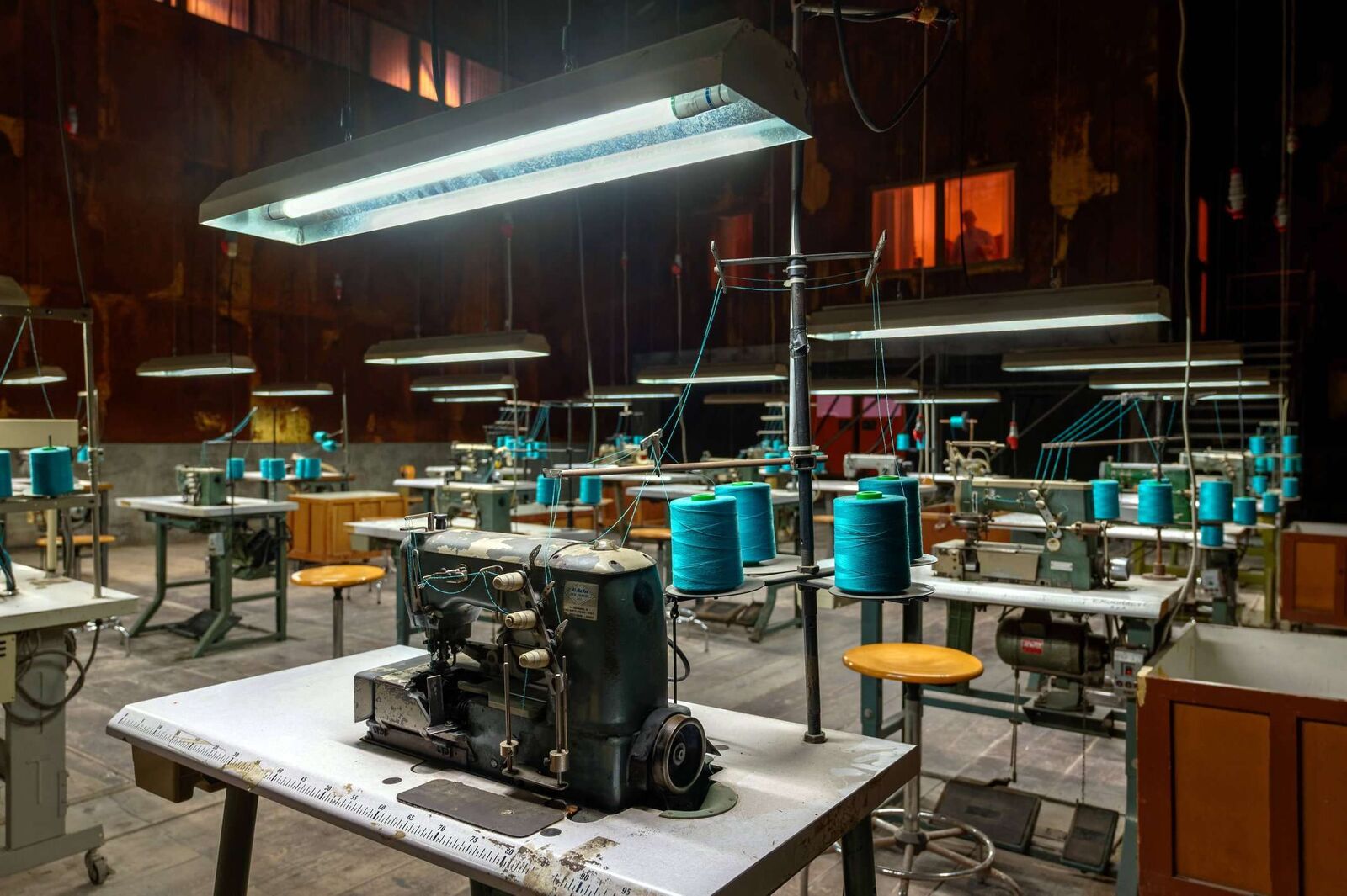 Neugierig auf das, was einen erwartet, betritt man den Pavillon. Dort begegnet man einer Reihe von verlassenen Fabrikräumen und Industriehallen. Maschinen, riesige Teile, stehen hier und da herum. Es riecht mal nach feuchtem Keller, mal nach kaltem Metall. Ein Raum steht voller Tische mit Industrienähmaschinen, wie in einer Textilmanufaktur, deren Arbeiter*innen längst verschwunden sind. Überwältigt von der Einsamkeit des Betriebs kommt man in eine dunkle Halle. Hat sich das Auge an die Dunkelheit angepasst, erkennt man einen Steg, umgeben von Wasser. In der Ferne leuchten weiße Punkte und spiegeln sich auf der Wasseroberfläche wider. Glühwürmchen sollen sie repräsentieren.