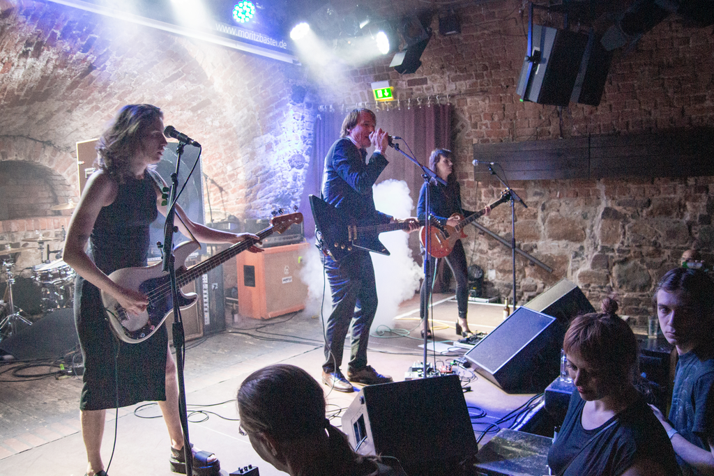 Am späten Abend testet die Noise-Rock-Band Gewalt aus Berlin mit ihrem geschätzten 190-Dezibel-Sound die Standhaftigkeit des altehrwürdigen Kellergewölbes der Moritzbastei, die sich direkt am Uni-Campus in der Innenstadt befindet. Die Band, bestehend aus Sänger und Gitarrist Patrick Wagner, Bassistin Helen Henfling und Gitarristin Jasmin Rilke, hat seit ihrer Gründung im Jahr 2015 mit ihrem repetitiv-brachialen Mix aus ballernden Drummachine-Salven und noisigen Rückkopplungsgitarren bereits für einige Furore gesorgt. Zu diesen Klängen kommen dann Wagners Texte, die in guten Momenten schlechte Laune, und in schlechten einen grenzenlosen Weltekel offenbaren.