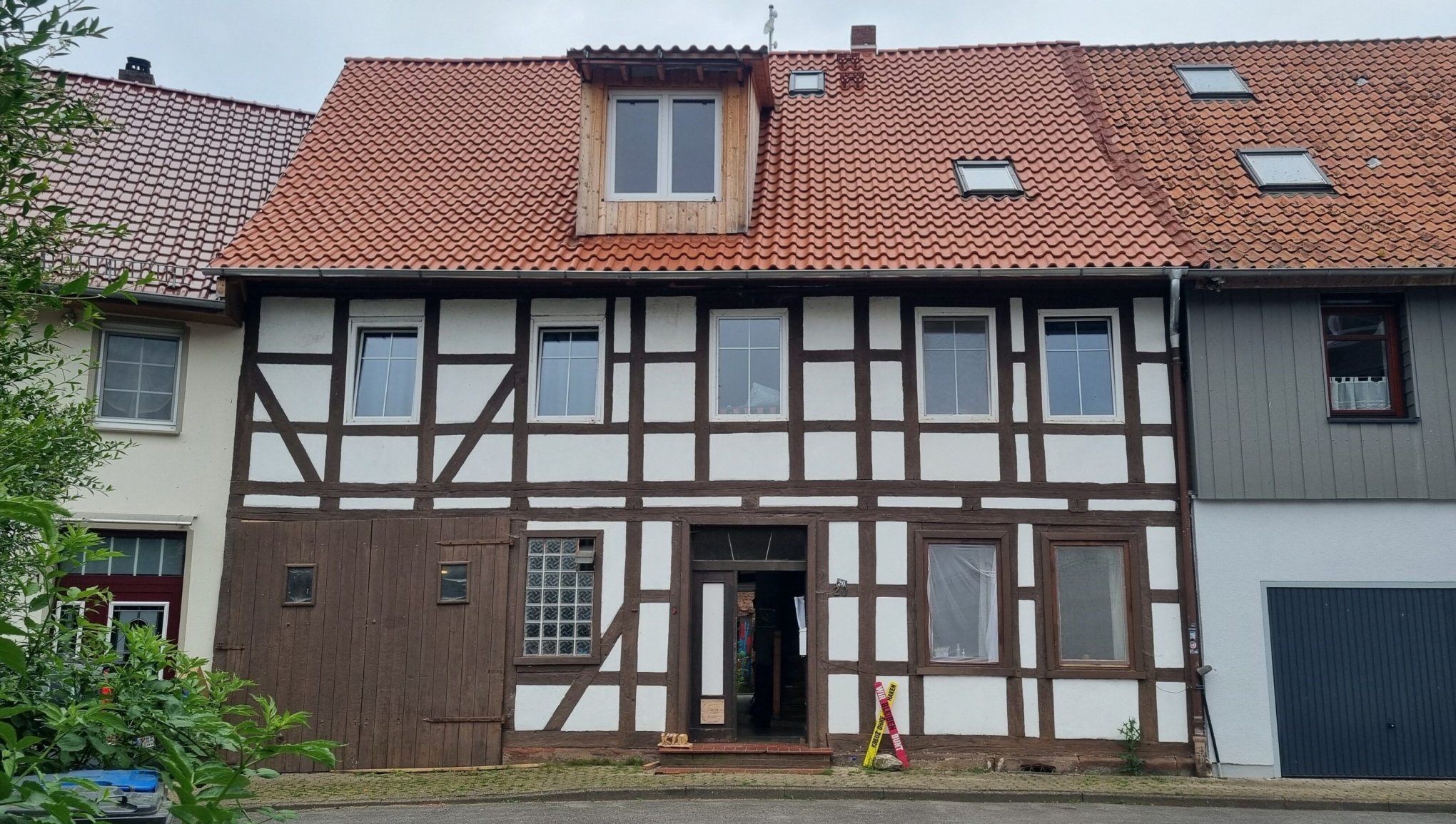 Am Ende der Knickstraße, die der K20 ihren Namen gab, biegt sie einmal rechts und dann wieder links ab. Direkt unter der Burg liegen drei weitere Häuser des Projekts. Das auf der rechten Seite des Trios sticht mit seinem blauen Fachwerk hervor.