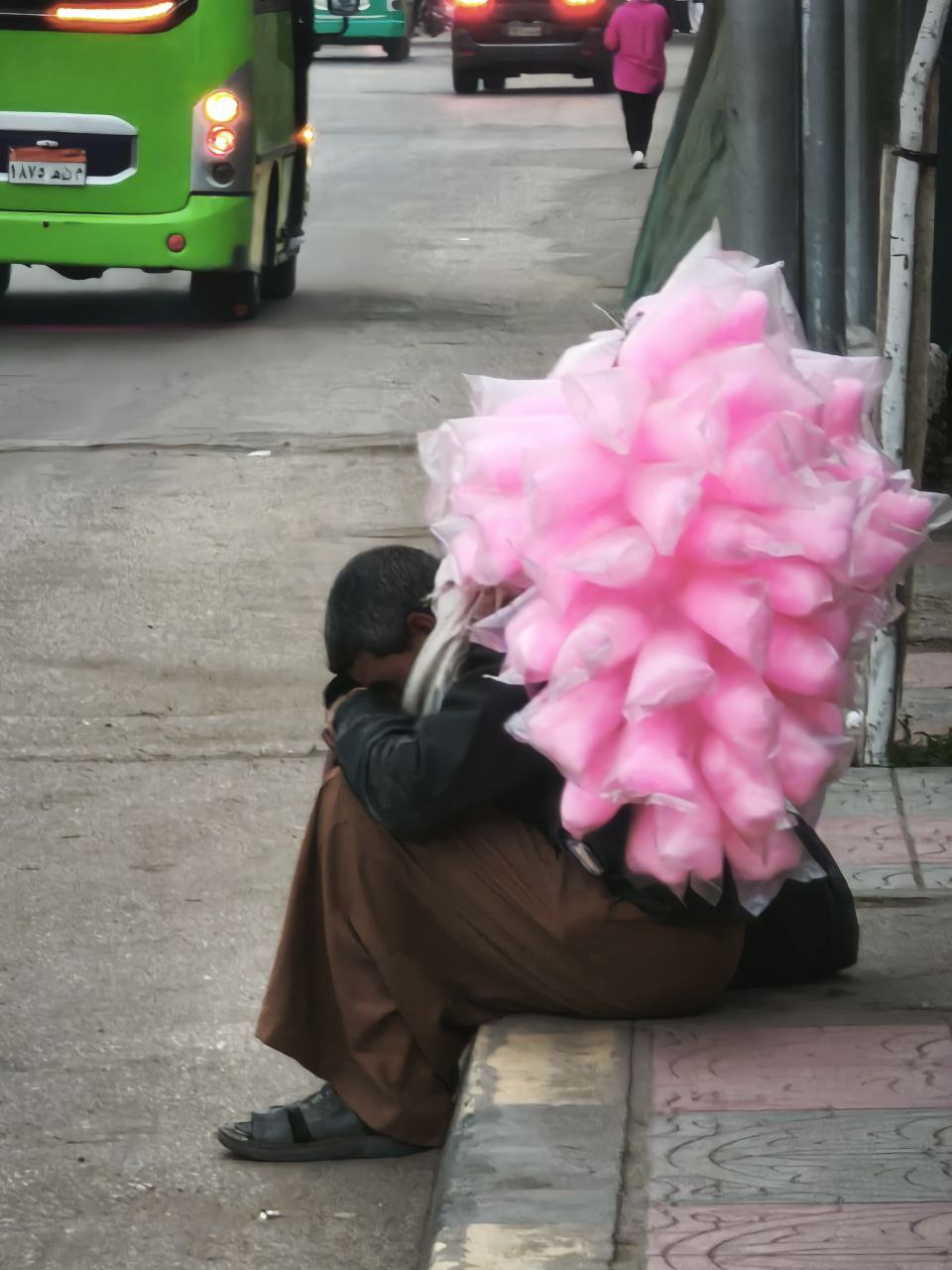 Auf dieser Reise zerbricht alles. Auch diese Freundschaft. Als ich gehe, ist es Abend. Ein Straßenverkäufer am Bordstein verkauft rosa Zuckerwatte in durchsichtigen Plastiktüten. Sieht aus, als wären es Ballons, die ihn nach oben ziehen müssten. So wie die Pyramiden im Film. Der Mann aber sieht zu niedergeschlagen aus.