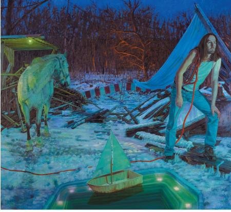 Mit 200 x 220 Zentimetern dominiert »Europa«. Nicht um die vom stiergestaltigen Zeus geraubte phönizische Königstochter der Sage geht es hier, auch nicht um den Kontinent ihres Namens. Dies ist die erste Fußangel, die Kalaizis auslegt. Denn er malt vor knorrig kahlem, mittig rätselvoll beleuchtetem Wald ein Brettergewirr auf vereistem Grund, den Baustellenbaken nach hinten begrenzen. Links steht ein langhaariger Mann in T-Shirt, ein rotes Seil über die Schultern, das vorbei an einem Pool mit Schiffchen zu einem Pferd hin ausläuft. Dessen Kopf ist abgewandt, als lausche es einem Laut; ob das Seil den Gaul bindet, ist nicht ersichtlich. Nicht einmal auf die – politisch gemeinte – Baustelle Europa lässt sich jenes melancholische Sujet festmachen, das lediglich einen als real vorgetäuschten, letztlich irrealen Mikrokosmos zeigt, wie er Kalaizis als Ziel seiner Malerei vorschwebt.