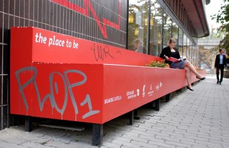 Eine überdimensionale Sprechblase klebt an der Fassade. Sie ist knallrot und eckig und nicht zu übersehen. Darunter steht eine wuchtige Bank: Auch die ist rot angemalt und 21 Meter lang. »the place to be« – der Ort an dem man sein muss – steht darauf zu lesen.
