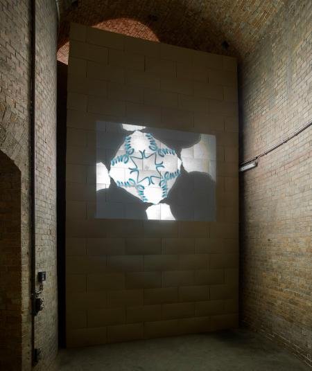 Umzugskartons sind dabei seine Requisiten. Sie versperren zu beiden Seiten den Eingang zum engen, äußeren Umgang und lenken so den Besucher in die übrigen vier Ringe. Dort hat Piscitelli an unregelmäßigen Orten Kartons zu massigen, deckenhohen Wänden von teils immenser Dicke getürmt, die in ihrer Linearität das Ebenmaß der Rund-Gänge brechen, sich rechtwinklig in Ecken einschmiegen oder einfach nur den Weg versperren – dann erhöhen sie für den Flaneur das Gefühl, sich in einem unentrinnbaren Labyrinth zu befinden. Die rund 1800 Kartons hat Piscitelli indes nicht nur dafür verbaut, sondern schafft sich aus ihnen gleichsam die Flächenraster für seine Schreibprojektionen.
