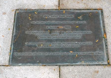 Als der Stadtbezirk die Tafel im Jahr 2000 in den Boden der November-Demonstration einließ, hatte der Gedenktafelbeauftragte des Stadtbezirks Mitte alle 22 Redner des 4.11.1989 dazu eingeladen. Gekommen sind ein Pfarrer, die Stasi-Unterlagen-Beauftragte Marianne Birthler und Markus Wolf, der einstige Stasi-General. Muss man mehr erklären in Sachen unvollendeter deutscher Revolution?