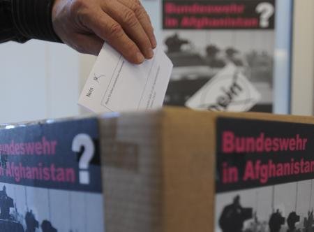 Zwischen deutschen Möhren und deutschem Kohlrabi fordert ein Plakat zum Nein zu deutschen Soldaten in Afghanistan auf. Rund um den kleinen Wochenmarkt auf dem Berliner Anton-Saefkow-Platz bitten drei Rentner, eine selbstgebastelte Wahlurne unterm Arm, die Passanten, mit abzustimmen über die Frage: Sind Sie für die Verlängerung des Bundeswehreinsatzes in Afghanistan?