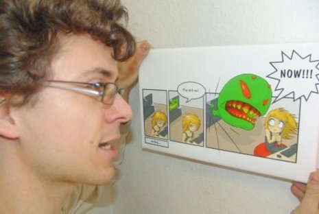 Das blonde Mädchen am Schreibtisch hat zu lange gearbeitet. Ihr Gesichtsausdruck ist genervt und sie scheint überfordert zu sein. Da flippt plötzlich ihre vernachlässigte Spielkonsole aus und ein riesiges, grünes Ungeheuer schießt aus dem Bildschirm. Auf zwei Sprechblasen erfährt der Betrachter, dass das Mädchen »jetzt endlich mit der Konsole spielen soll …«.