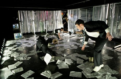 Martin Laberenz' Interpretation des Dath-Essays ist so verspielt und kreativ, wie man es von einem 1982 geborenen Regisseur an einer Experimentierbühne erwarten kann. Politisch ist sie, ganz im Gegensatz zur Vorlage, nicht. Bereits im ersten Bild zeigt der Regisseur, als was er Daths Schrift ausgemacht hat: als stichhaltige Theorie, die an der menschlichen Praxis scheitert. Die ersten fünfzehn Minuten lang sind drei stille Männer im Geheimdienstdress damit beschäftigt, die losen Seiten des Dathschen Manuskripts auf den schwarzen Bühnendielen auszulegen. Akurat reihen sie Seite an Seite, bis alles zusammenpasst, fast. Doch im papiernen Mosaik klafft ein Loch. Den fehlenden Baustein dort einzufügen, erweist sich als unmöglich. Zum Flieger gefaltet, verfehlt das Blatt sein Ziel. Es dahin zu tragen, wohin es gehört, heißt, das wohlgeordnete Werk zu zerstören. Schuhsohlen zerfleddern das schöne Ganze, die Männer rutschen und stolpern über den Gedankenteppich. Am Ende ist alles zerknäult.