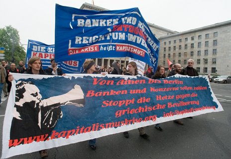 (ND). Das globalisierungskritische Netzwerk Attac demonstrierte am Mittwochabend unter dem Motto »Von Athen nach Berlin – Banken und Konzerne sollen zahlen!« friedlich vor dem Finanzministerium und in der Berliner Innenstadt. Laut Polizeiangaben nahmen rund 250 Menschen teil. Michael Prütz vom Berliner Bündnis »Wir zahlen nicht für Eure Krise!« erklärte, dass nicht die griechische Bevölkerung schuld an der Krise im eigenen Land sei, sondern vielmehr der Umstand, dass griechische Reeder und die Kirche kaum Steuern an den Staat entrichten müssen. Er kritisierte das neoliberale Spardiktat der EU. Die Demonstration war ein erster Schritt zur Mobilisierung für die bundesweite Massendemonstration am 12. Juni, mit der ein deutliches Zeichen gegen den Sozialabbau gesetzt werden soll. Foto: dpa/Gabbert