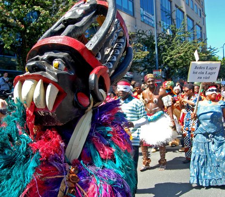 Dieses afrikanische Ritual fand nicht in Nigeria statt, wo die Masken angefertigt wurden, sondern in Jena. Die beiden Flüchtlingsorganisationen »Karawane für die Rechte der Flüchtlinge und Migranten« und »The VOICE Refugee Forum« feierten am Wochenende ein Festival, auf dem sie der vielen Tausenden gedachten, die den Weg in die Europäische Union nicht geschafft haben, sondern mit ihren Booten im Mittelmeer kenterten oder in den Bergen Südosteuropas erfroren. »Aber wir sind hier«, ruft Sunday Omwenyeke zur Eröffnung des Festes von der Bühne am Pulverturm.