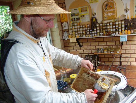 Gestapelt und ordentlich sortiert stehen die prall gefüllten Gläser im Hofladen. Kerzen in verschiedenen Formen drängeln sich in den Regalen. Ein Duftgemisch aus Honig und Wachs liegt in der schwül-warmen Luft. Doch das Arbeiten bei offener Tür funktioniert nicht – denn der aufdringliche Geruch lockt die Bienen an.