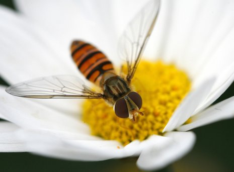 Versteht man unter Schweben gemächlichen Gleitflug, passt ihr Name schlecht. Man sollte sie statt Schweb- eher Schwirrfliegen nennen, sieht man sie so in der Luft stehen, wobei ihre Flügel nur als silbriger Schimmer erkennbar sind. Die überwiegend schwarz-gelb oder schwarz-weiß gezeichneten Schwirrer sind häufige Blütensucher, bei denen man sich sehr wundern muss, dass sie mit ihrem Tupfrüssel Blütenstaub aufnehmen können (Foto: dpa). Als Larven sind sie übrigens Blattlausfresser.