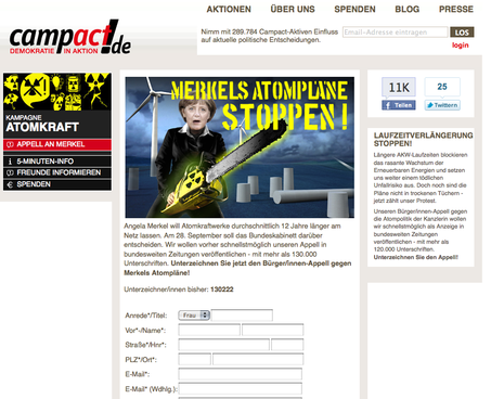 Mindestens vier Unterschriftenkampagnen gegen Merkels energiepolitische »Revolution«? Das Kapital ist besser, jedenfalls straffer organisiert. Die Online-Kampagne »Mut und Realismus für Deutschlands Energiezukunft« (oder in Kurzform: »weiter Kernenergie und Kohle«) muss erstens keine Konkurrenz befürchten. Sie hat zweitens eine klare Zielgruppe: Die meisten Unterschreibenden sind Mitarbeiter von Kohle- und Atomkraftwerken. Und die Kampagne hat, drittens, noch einen weiteren Vorteil: Den Aufruf unterschrieben auch die Spitzen der vier großen Energiekonzerne. Des BDI. Und der Deutschen Bank.