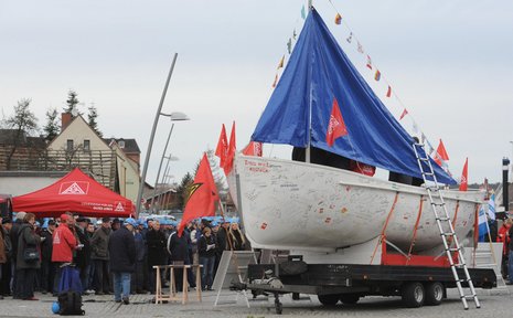 Wolgast (dpa/ND). Die Peene-Werft in Wolgast hat die krisenbedingte Kurzarbeit weitgehend abgebaut, doch anhaltende Probleme im Schiffbau haben am Dienstag rund 450 Werftarbeiter auf die Straße getrieben. Sie forderten die Regierung auf, die deutschen Werften weiter mit einem Bürgschaftsrahmen für Schiffsneubauaufträge in Höhe von 90 Prozent zu unterstützen. »Wir brauchen die Verlängerung des Deutschlandfonds«, sagte der IG-Metall-Bevollmächtigte Guido Fröschke. Jede Absenkung des Bürgschaftsrahmens mache die Kredite teurer und den Schiffbaustandort Deutschland unattraktiver.