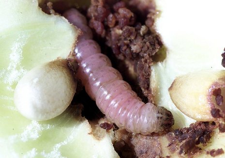 In Kirschen sind es Fliegenmaden, die Larven der hübschen Kirschfliege. Raupen sind dagegen die sogenannten Maden in Pflaumen und Äpfeln. Sie entwickeln sich zu Kleinschmetterlingen, die als Pflaumen- und Apfelwickler bekannt sind. Der Apfelwickler (Foto: dpa) kann auch Birnen, Pflaumen und sogar Walnüsse befallen. Wie Maden leben in jungen Pflaumen auch Hautflüglerlarven, die von Pflaumensägewespen stammen und die noch gut sichtbare Köpfe und Beine haben, die ihnen das Überwechseln zu anderen Früchten ermöglichen. Sie stören meist nicht, denn wenn die Pflaumen reif sind, sind sie längst zur Verpuppung in den Boden abgewandert. Man wird ihnen also mildernde Umstände zuerkennen.