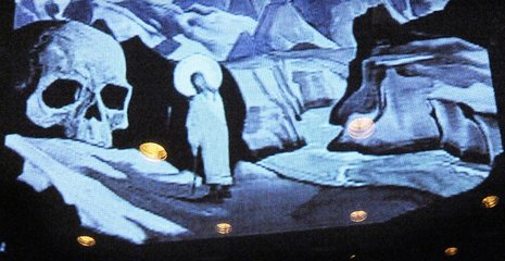Armin Petras hat auch dieses epische Werk bearbeitet und nun im Studio des Maxim Gorki Theaters als Koproduktion mit dem Staatstheater Stuttgart auf die Bühne geschickt. Düsternis herrscht, und in einem wie von Hexen gezogenen Kreis findet gespenstisches Treiben statt, mit unheilschwangeren ideologischen Debatten und brutalen Kämpfen bis auf die nackte Haut. Menschen verwandeln sich in Puppen (Puppenbau: Oliver Köhler) und wieder zurück, Masken schützen Ungeheuer – schier undurchdringliche Geheimnisse walten. Über die Wände des grauen Bühnen-Kastens (Raum/Licht: Norman Plathe) ziehen Bilder, Videos, verwischt, aber auch schreckhaft plakativ.