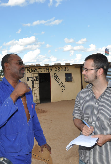 »Warum kommt ihr und fragt mich nach der Trockentoilette?«, fragt Naboth Nangolo skeptisch. Der 50-jährige Familienvater versteht nicht, warum wir gerade an dem stillen Örtchen so großes Interesse haben. »Wir sind von SODI und wollen wissen, ob Ihre Toilette funktioniert. Wissen Sie, Spenden aus Deutschland haben den Bau ermöglicht«, vermittelt SODI-Mitarbeiter Andreas Bohne die freundliche Absicht der Aufwartung.