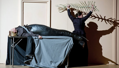Ob Fischschwanz oder Belle-Epoque-Kleider, was an Mensch und Nixe noch lebendig ist, wird eingeengt und zugestutzt. Unerträglich sind die Schmerzen, diese Verpuppung loszuwerden. Barrie Kosky führt es drastisch vor: Rusalkas Unterleib wird aufgeschnitten und von einer riesigen Fischgräte befreit. Und doch bleibt sie Fisch, am Ende steckt sie sich im freiwilligen Martyrium den Angelhaken in den Mund, die Rute hält der tote Prinz noch in den Händen. Vielleicht kann sie mit ihm hinaufschwimmen, der ewigen Verdammung trotzen.