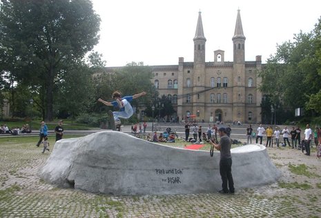 Gegen Ende dieser Veranstaltungsserie geht »BISAR« nun vor die Tür. »Papa und Ich« heißt aus unerfindlichen Gründen die begehbare Zementskulptur, die bis in den Herbst vor dem Kunsthaus Bethanien am Mariannenplatz steht. Sie ist rund, bis anderthalb Meter hoch und mit sechs oder sieben Schritten zu durchmessen. Seit Freitag findet dort, sobald es das Wetter zulässt, eine permanente »Session« statt – das also, was der britische Architekturhistoriker Iain Borden einmal eine »kollektive Kritik von Architektur« genannt hat.