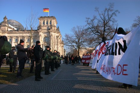 Berlin, wo die Occupy-Aktionen zuletzt spürbar nachgelassen hatten, sei damit wieder zurück in der Phalanx des weltweiten Widerstands, verkündet in diesem Moment auf der Bühne Christoph Bautz vom Kampagnennetzwerk Campact, das in Zusammenarbeit mit Organisationen wie Attac, Parteien und Gewerkschaften in nur zwei Wochen die Proteste organisiert hat. Das grinsende Guy-Fawkes-Gesicht, das 2005 durch die Verfilmung eines orwellesken Comic-Romans über ein faschistisches England der nahen Zukunft zu einer »Ikone« der Popkultur geworden ist, ist an diesem Nachmittag nicht der einzige Botschafter aus dem tatsächlich weltweiten Protestzusammenhang. Eine Reminiszenz an die Platzbesetzungen von Ägypten über Spanien über Israel bis in die USA, die vielerorts das Gesicht des Jahres 2011 bestimmt haben, sind auch die leichten Bergsteigerzelte, die eine Gruppe von Demonstranten unter großem Beifall in Richtung Bundestag reckt.