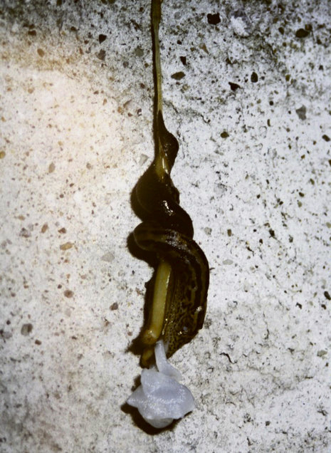 Wie viele andere Schnecken sind Schnegel Zwitter, so dass ihnen manches menschliche Problem erspart bleibt. Auch als solche waren sie in ihrem Verhalten würdevoll - während man etwa bei Insekten immer wieder sieht, dass die Paarung eine Vergewaltigung ist. Bei meinen Egelschnecken ist eine sehr kurze Verlobungszeit üblich. Sie gleiten eine Weile Kopf an Schwanz umher, ehe sie sich aufhängen. Obwohl sie ziemlich gewichtig sind, hängen sie sich zur Paarung einvernehmlich an einem zähen Schleimfaden auf, worauf sie ihre erstaunlich langen Begattungsorgane umeinander schlingen.