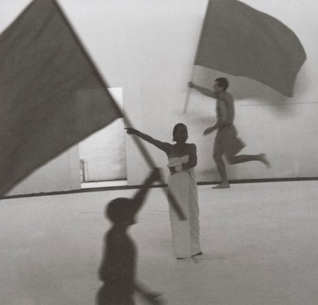Die Frau im Badetuch ist Rosa Luxemburg. Im Zentrum eines heftigen Fahnenschwungs. Das Badetuch erzählt vom Gegenteil aller landläufigen Politik, die ja nichts Privates und Intimes hat. Diese junge Frau ist der lebendige Widerspruch zum Eingeschnürtsein durch eine Funktion. Hier findet ein Dirigat statt in Nähe zur unverstellten Natur: Eine Hand zeigt die Richtung, die andere schützt vor Nacktheit. Blöße zeigen, Blöße verbergen, die zwei Pole der Existenz. Jutta Hoffmann in »Verratenes Volk« von Einar Schleef (2000) am Deutschen Theater Berlin.