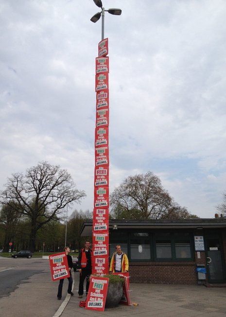 Lauter Erfolgsmeldungen der LINKEN in Schleswig-Holstein zum Wahlkampfende. Diesen Lampenplakatturm in Lübeck schoben die Aktiven über jede Fünfprozenthürde hinaus nach oben. Bundestags-Fraktionschef Gregor Gysi begrüßte in Flensburg mit der 36-jährigen Kielerin Aparecida Teodoro das 1000. Mitglied im Landesverband. Zum Nachtwahlkampf wurde der Partei-Bollerwagen mit Anleitungen zur Revolution in die Lübecker Fußgängerzone geschoben - zur Freude von Kino- und Restaurantbesuchern. Und in einer Kieler »Speakers Corner« lasen Genossen unter freiem Himmel aus dem Wahlprogramm. Hanisch