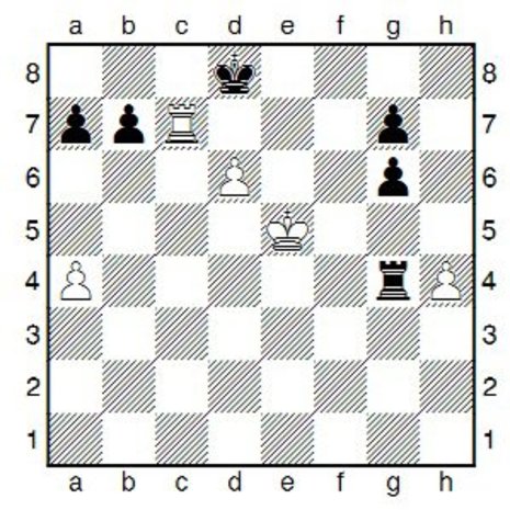 1.e4 d5 2.exd5 Dxd5 3.Sf3 Lg4 4.Le2 Sc6 5.d4 0-0-0 6.Le3 e5 7.c4 Da5+ 8.Ld2 Lb4 9.d5 Lxf3 10.Lxf3 Sd4 11.Sc3 Da6 12.Le2 Sf6 13.a3 Lxc3 14.Lxc3 Sxe2 15.Dxe2 The8 16.0-0-0! [Die lange Rochade verbindet alle Figuren 16.Lxe5? Txe5 17.Dxe5 Te8; 16.0-0? Txd5] 16...Kb8 17.The1 Sd7 18.Dg4 Dg6? [18...Sb6 ist nicht schön, wäre aber notwendig gewesen 19.Lxe5 f6 20.Lc3 Dxc4 21.Dxc4 (21.Dxg7 Df4+) 21...Sxc4=] 19.Dxg6 hxg6 20.h4 f6 21.Kc2! Th8 22.g3 Th5 23.Ld2 Kc8 24.b4 Sb6 25.Kb3 Tf5 26.f4 exf4 27.g4 Te5 28.Lxf4 Tee8 29.a4 Sd7 30.c5 Se5 31.Lxe5 Txe5 32.Txe5 fxe5 33.Kc4?!= [In einer Blitzpartie kaum zu finden, aber besser: 33.Kc3 Tf8 34.c6 Tf4 35.Te1] 33...Tf8 34.d6 Tf4+ 35.Kd5 cxd6? [Jetzt holt sich Morosewitsch sein Vorteil zurück 35...Txb4 36.Kxe5 Txa4=] 36.cxd6 Kd7 37.Kxe5 Txb4 38.Tc1 Txg4 39.Tc7+ Kd8 [Im Diagramm] 40.a5! [40.Txg7? Txh4 41.a5 Tb4=] 40...Txh4 41.Txb7 a6 42.Txg7 Th1 43.Ta7 g5 44.Txa6 g4 45.Ta8+ Kd7 46.Ta7+ Kd8 47.Tg7 Te1+ 48.Kd5 Td1+ 49.Kc6 Tc1+ 50.Kb6 Tb1+ 51.Ka7 Td1 52.a6 Txd6 53.Kb7 Td1 54.a7 Tb1+ 55.Kc6 Tc1+ 56.Kd5 Td1+ 57.Ke4 1-0