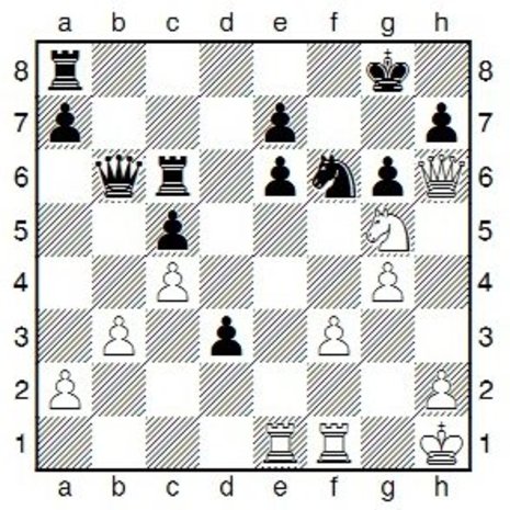 Carlsen, Magnus (ELO: 2843) - Anand, Viswanathan (2780) [B52- Sizilianisch; Rossolimo Variante], 5. Chess Masters Final; Bilbao (Spanien) 12.10.2012 (9. Runde)1.e4 c5 2.Sf3 d6 3.Lb5+ Ld7 4.Lxd7+ Dxd7 5.c4 Sf6 6.Sc3 g6 7.d4 cxd4 8.Sxd4 Lg7 9.f3 Dc7 [Neu!] 10.b3 Da5 11.Lb2 Sc6 12.0-0 0-0 13.Sce2 Tfd8 14.Lc3 Db6 15.Kh1 d5 16.Sxc6 [Anand steht besser nach: 16.cxd5? Sxd5 17.exd5 Txd5] 16...bxc6 17.De1 Tdc8 18.e5 Se8 19.e6! [Objektiv gesehen vielleicht nicht der beste Zug, aber einer, wie ihn nur Carlsen machen darf: Er spielt gegen den Weltmeister, opfert einen Bauern im 19. Zug und gewinnt elf Züge später - einfach unglaublich!] 19...fxe6 20.Sf4 Lxc3 21.Dxc3 d4 22.Dd2 c5 23.Tae1 Sg7 24.g4 Tc6 25.Sh3! Se8 [Die andere Option von Anand wäre gewesen: 25...Dd8 26.Dh6 Kh8 27.Sg5 Dg8. Ziemlich erniedrigend] 26.Dh6 Sf6 27.Sg5 d3? [Im Diagramm] 28.Te5! Kh8 29.Td1 Da6 30.a4 [Anand gibt auf, weil d3 nicht zu verteidigen ist.] 1- 0